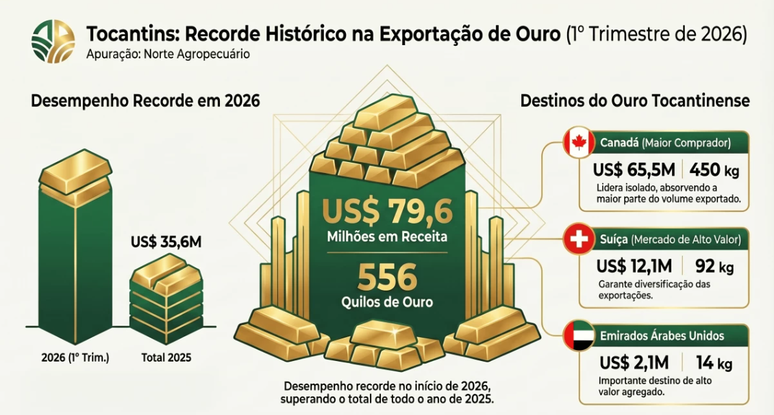 O Tocantins encerrou o primeiro trimestre de 2026 com um desempenho sem precedentes na mineração. Pela primeira vez na história, o estado exportou 556 quilos de ouro em apenas três meses, gerando uma receita superior a US$ 79,6 milhões (aproximadamente R$ 400 milhões).