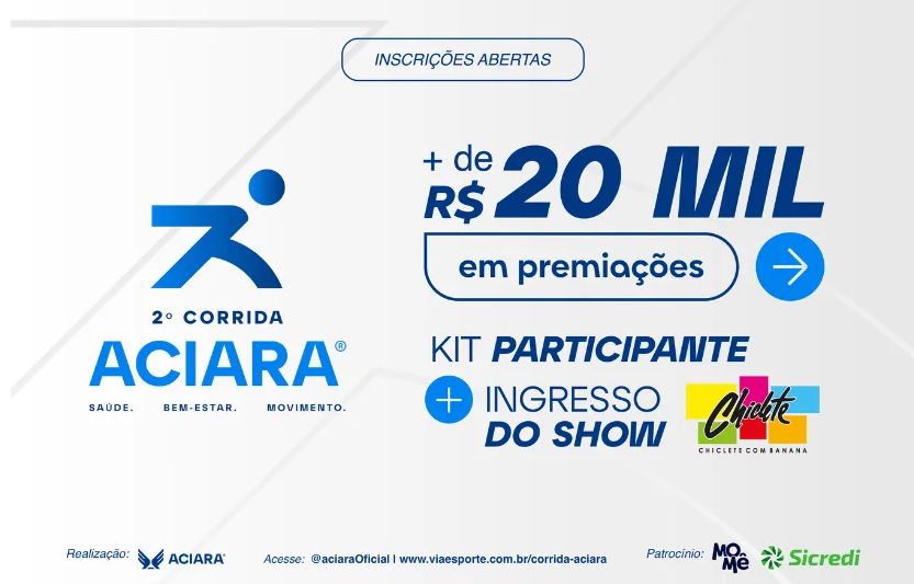 - Premiação: Mais de R$ 20 mil em prêmios, divididos entre as categorias Geral (Masculino e Feminino), 60+ e uma categoria exclusiva para empresários e colaboradores associados à ACIARA.