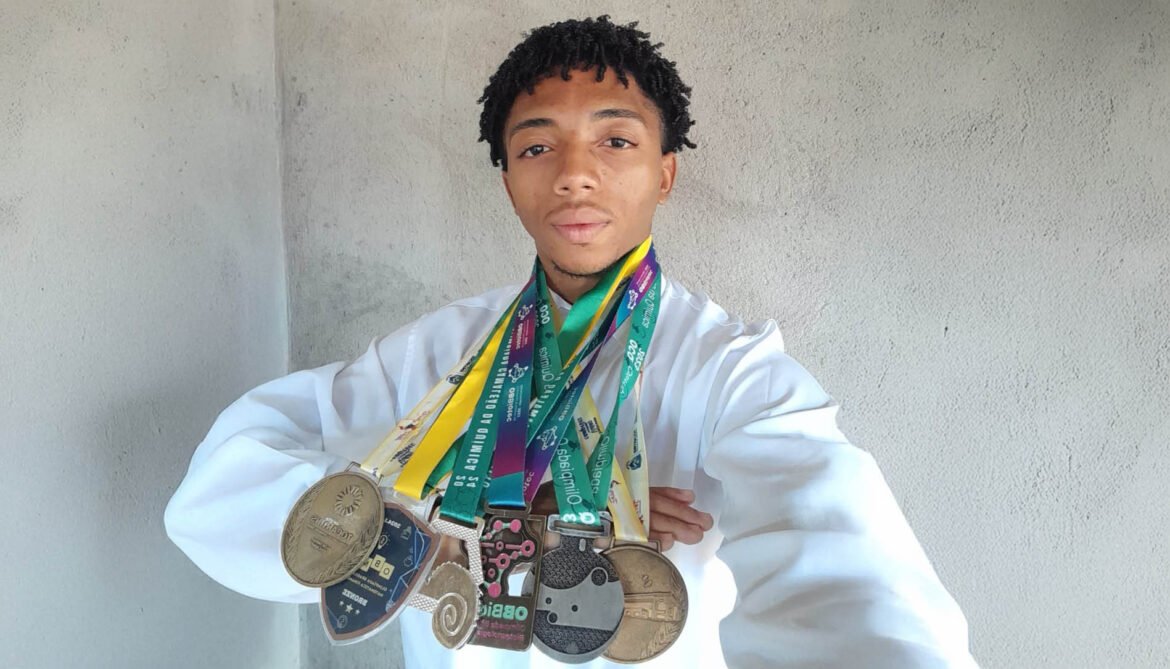 Ângelo também conquistou medalha de prata na Olimpíada Camaleão de Química e ressalta o ambiente escolar como diferencial.