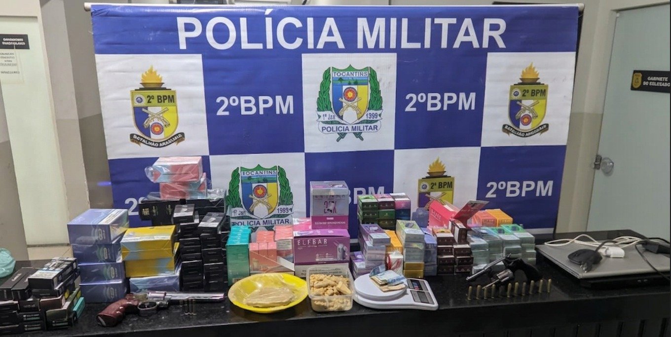 A Polícia Militar do Tocantins (PMTO) capturou, na noite desta terça-feira (7), dois homens de 25 e 30 anos que possuíam mandados de prisão preventiva em aberto por homicídio qualificado. A operação, realizada pelo 2º Batalhão em Araguaína, resultou ainda na apreensão de armas de fogo, crack e centenas de dispositivos eletrônicos ilegais.